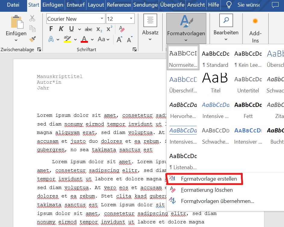 Dazu gehst du einfach im Start-Tab auf Formatvorlagen und klickst auf „Formatvorlage erstellen“. Hier kannst du die Vorlage noch benennen und schon hast du die Vorarbeit für alle weiteren Manuskripte geleistet. Toll, oder?