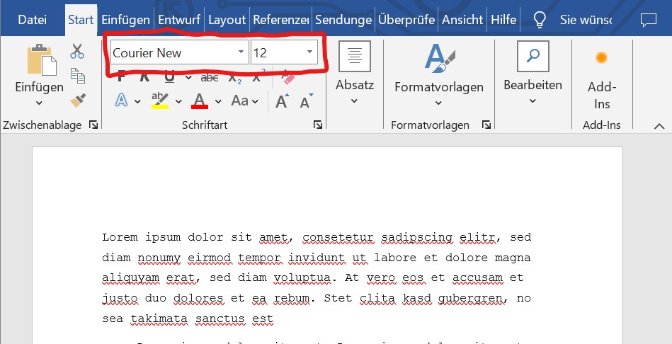 1. Schriftart und -größe: Wähle die Schriftart „Courier New“ in 12 pt. Ja, sie sieht ein bisschen altmodisch aus, aber sie ist super, weil sie nichtproportional (monospaced) ist – das bedeutet, jedes Zeichen nimmt den gleichen Platz ein. Wie auf der Schreibmaschine früher.