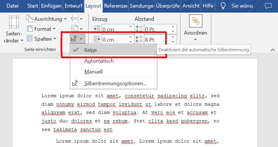 7. Silbentrennung: Überprüfe, dass die Silbentrennung deaktiviert ist.